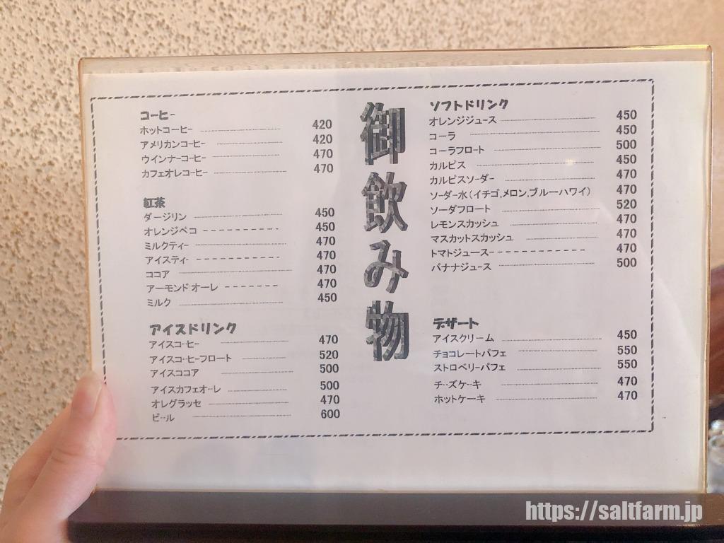 食事系のメニューは、モーニングセット(9時半~13時半)、軽食類、麺類、ご飯類があります。