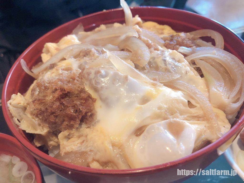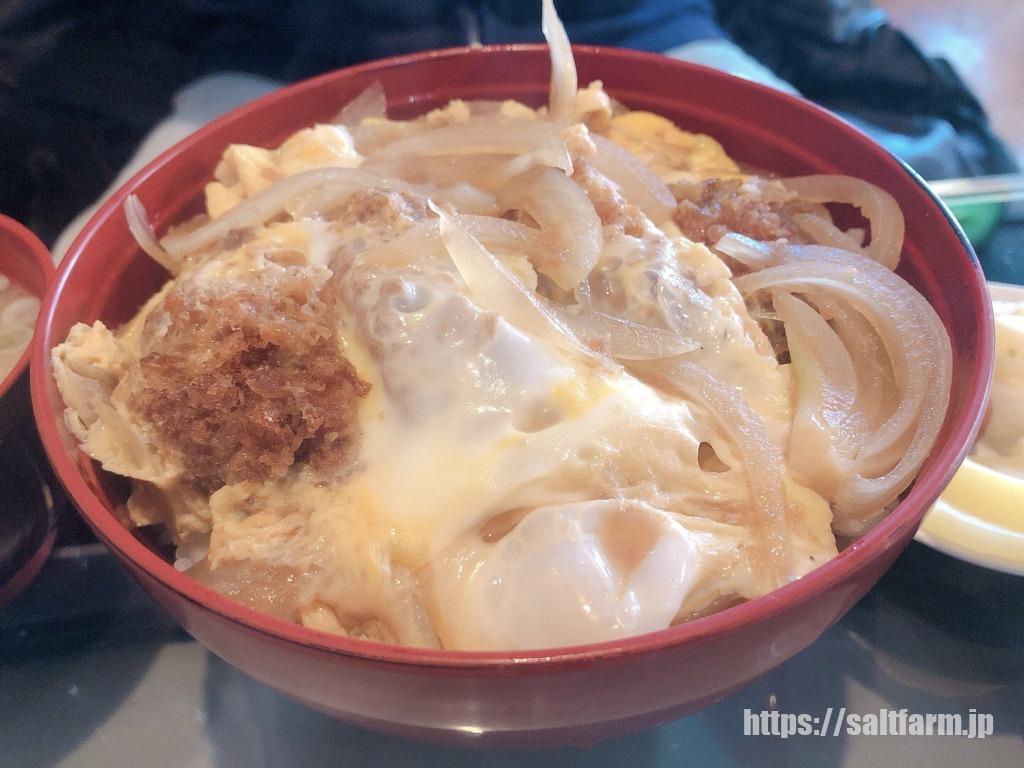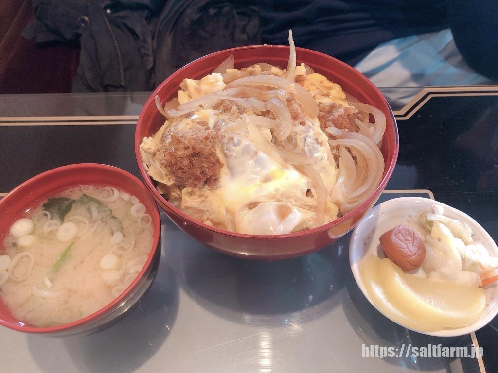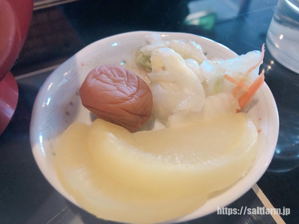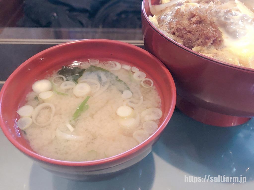 カツ丼には、味噌汁と漬物&梅干しがセットになっています。