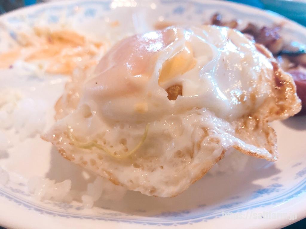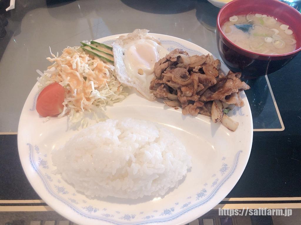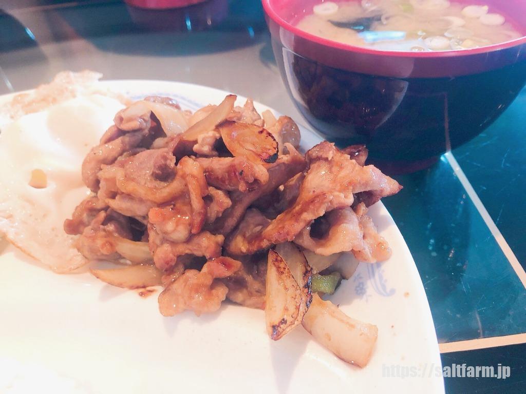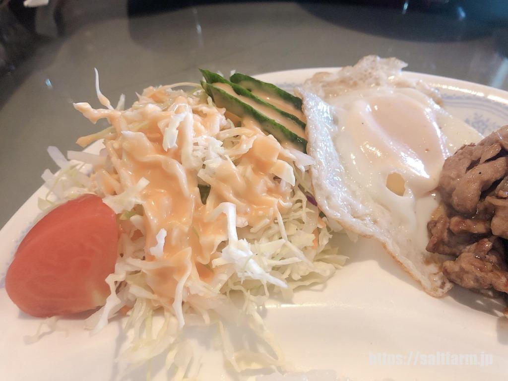 焼肉にサラダと目玉焼き、味噌汁もついています。