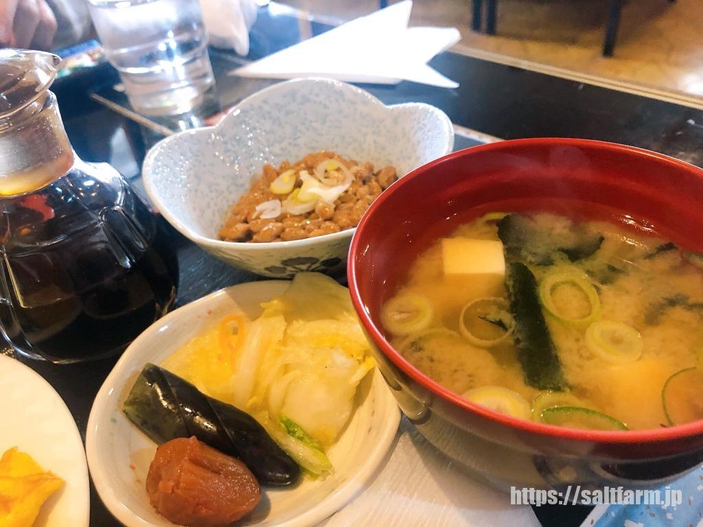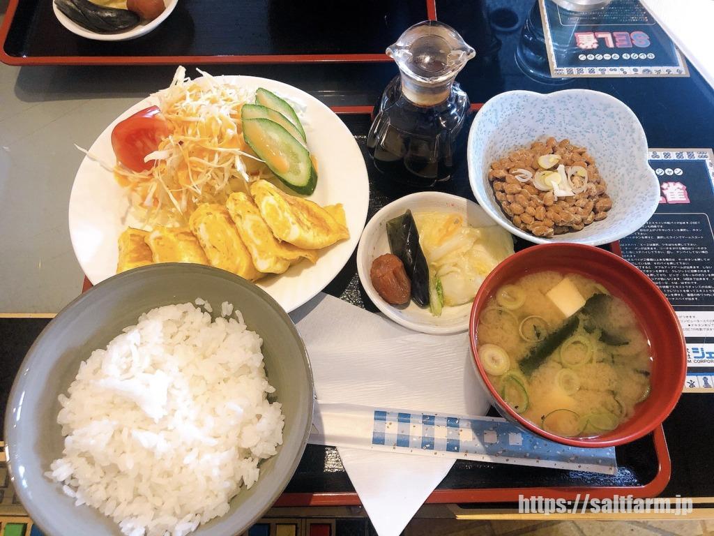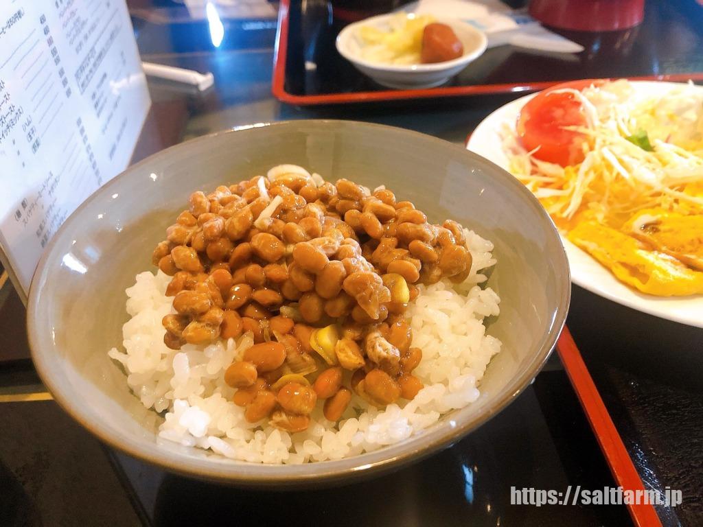 納豆にごはん、味噌汁だけのセットかと思いきや、たまご焼きとサラダ、漬物もついています。