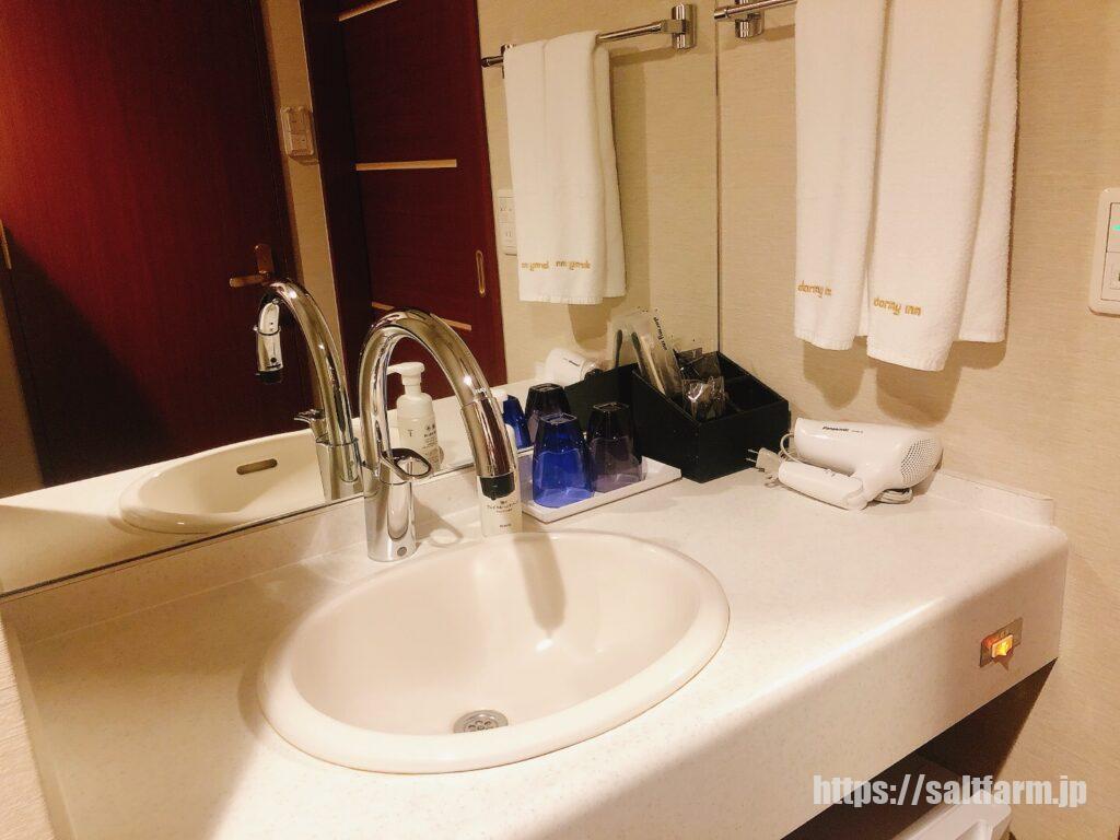 洗面台にはアメニティが設置されています。歯ブラシ、カミソリ、クシ、綿棒など、必要最低限のものが揃っていました。