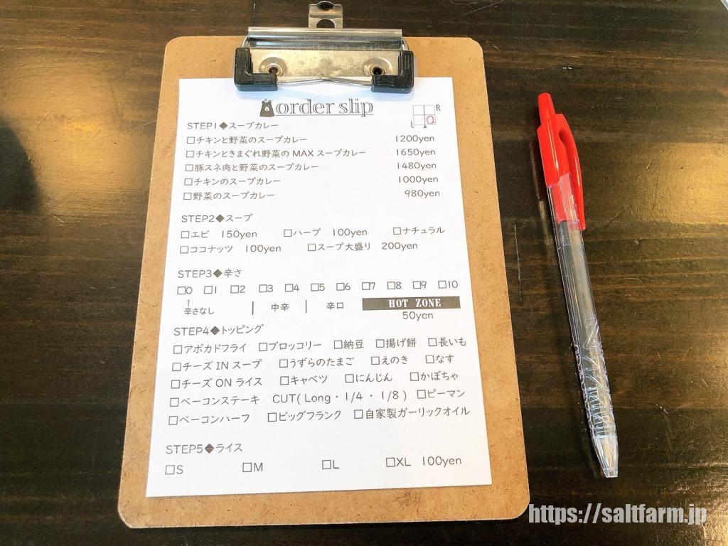 スープカレーを注文するときは、テーブルの上に置いてあるオーダー表に記載して渡します。