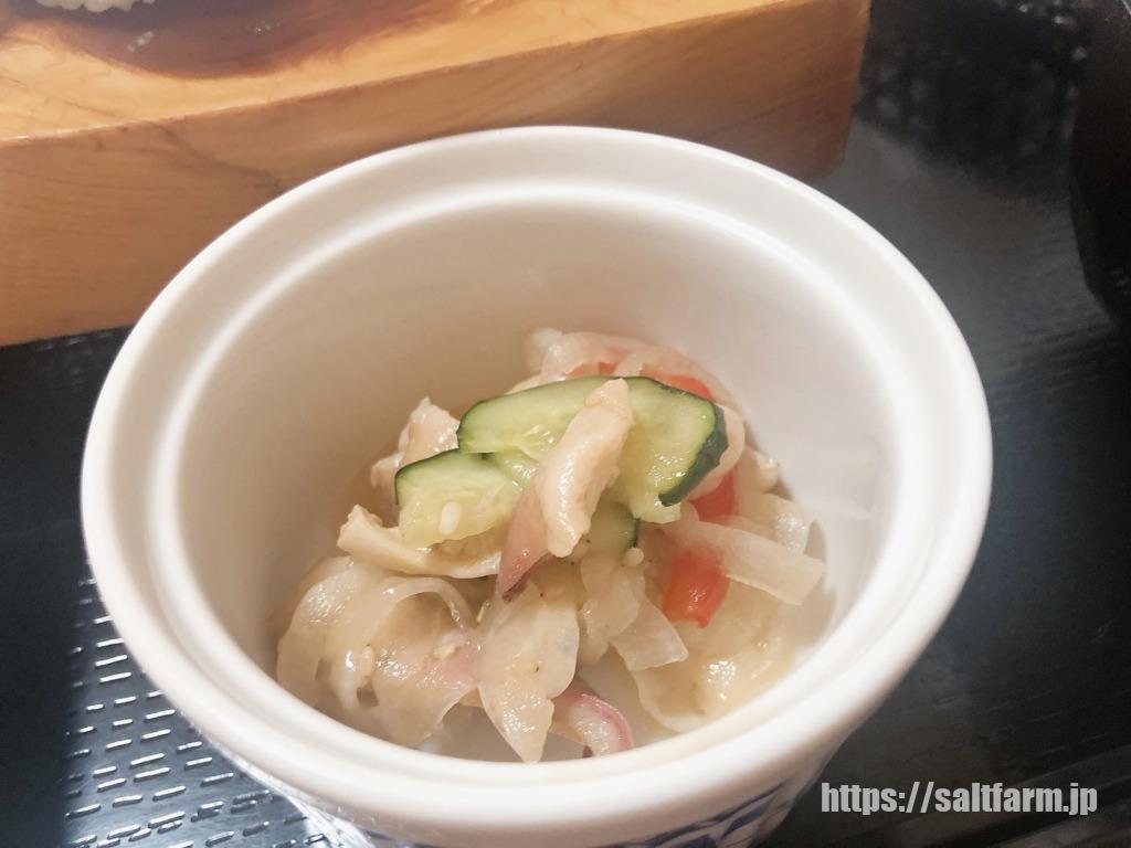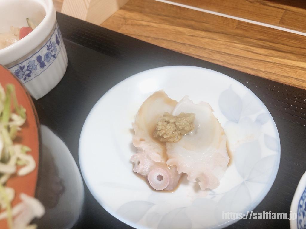大きめのタコの刺身が2切れ。ほどよい弾力で、噛むほどに旨みが出てきます。