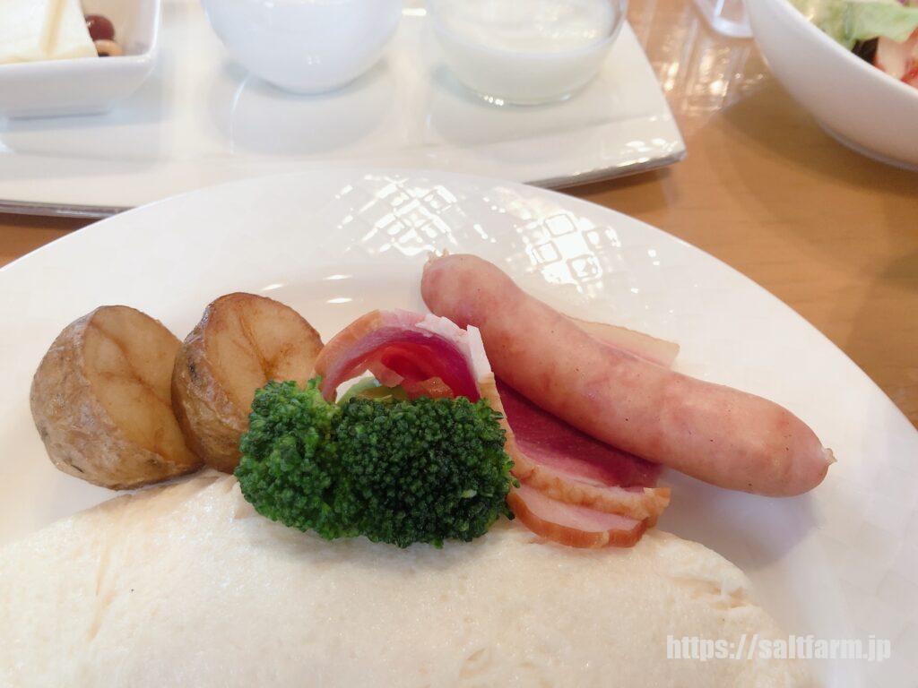 付け合わせは、じゃがいも、ベーコン、ウィンナー、ブロッコリーです。