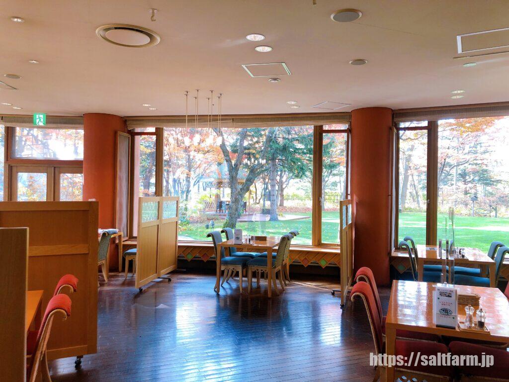 朝食会場は、大きな窓から光が差していて開放感があります。広い庭を見ながらの朝食は最高です。
