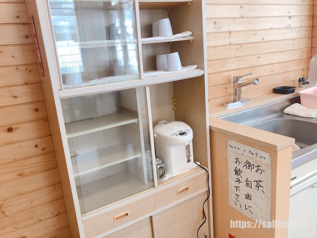ここのほかにも部屋があり、「ご自由にお飲みください」のお茶がありました。