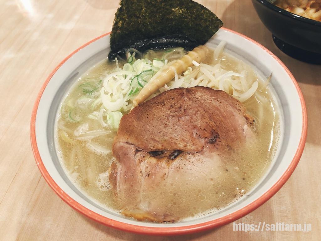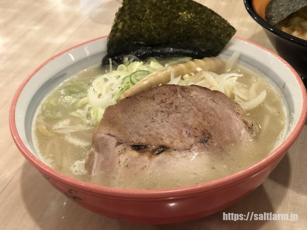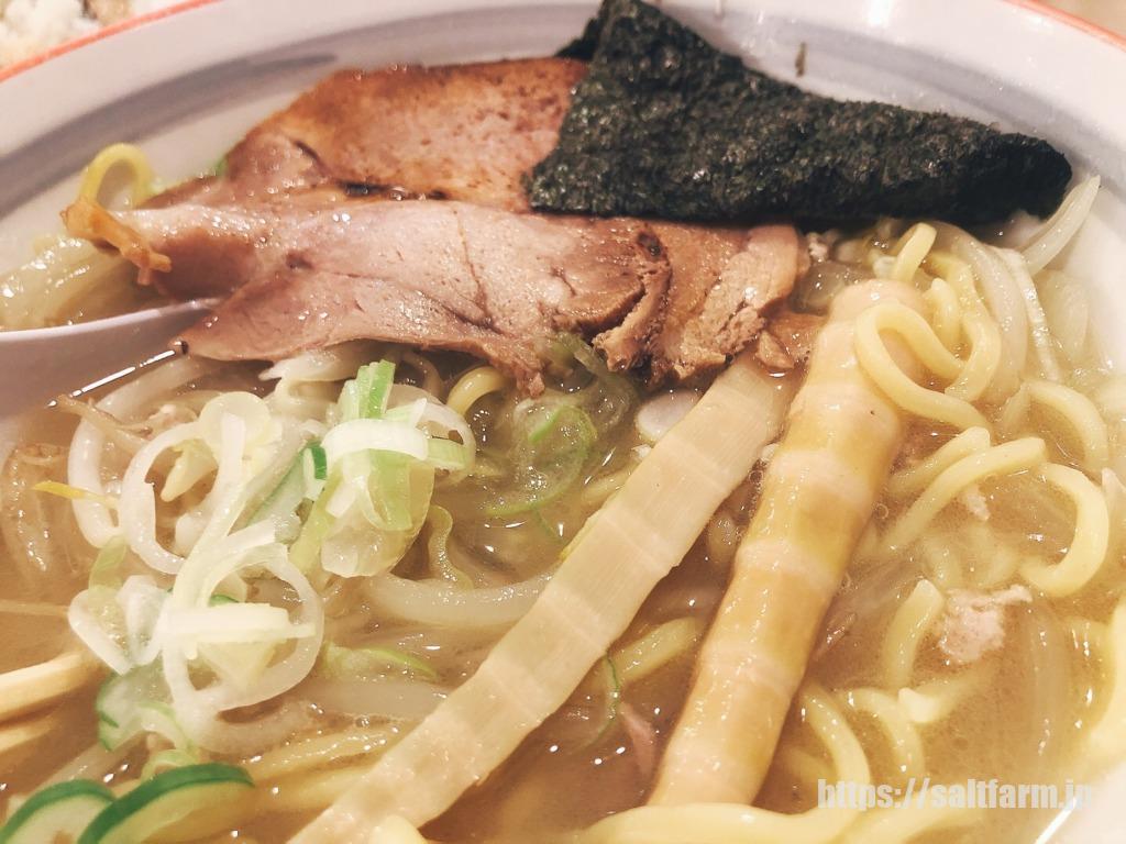 チャーシューは弾力があるので、噛みごたえがありました。スープはにんにくが効いています。塩ですがあっさり系ではなく、ややこってり系ですかね。