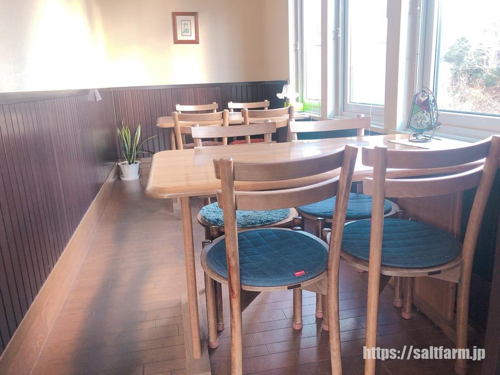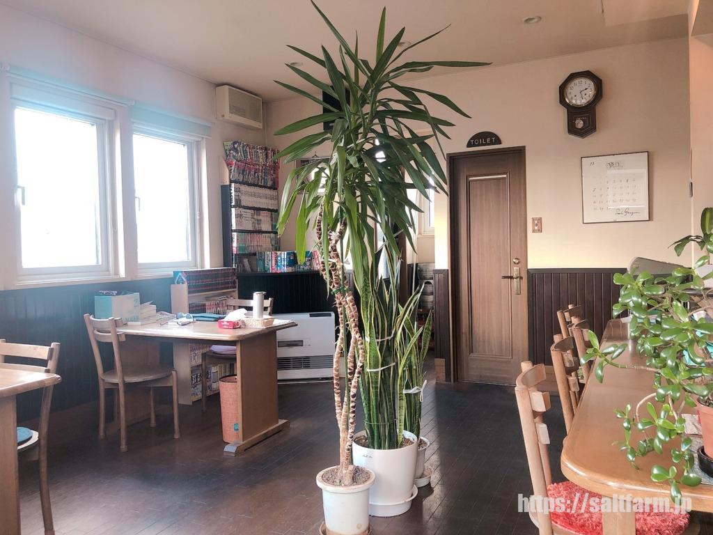 テーブル席が4つ(2人掛け1つ、4人掛け3つ)、カウンター4席。入り口付近にある2人掛けの席は、物が置いてあって使えないようになっていました。