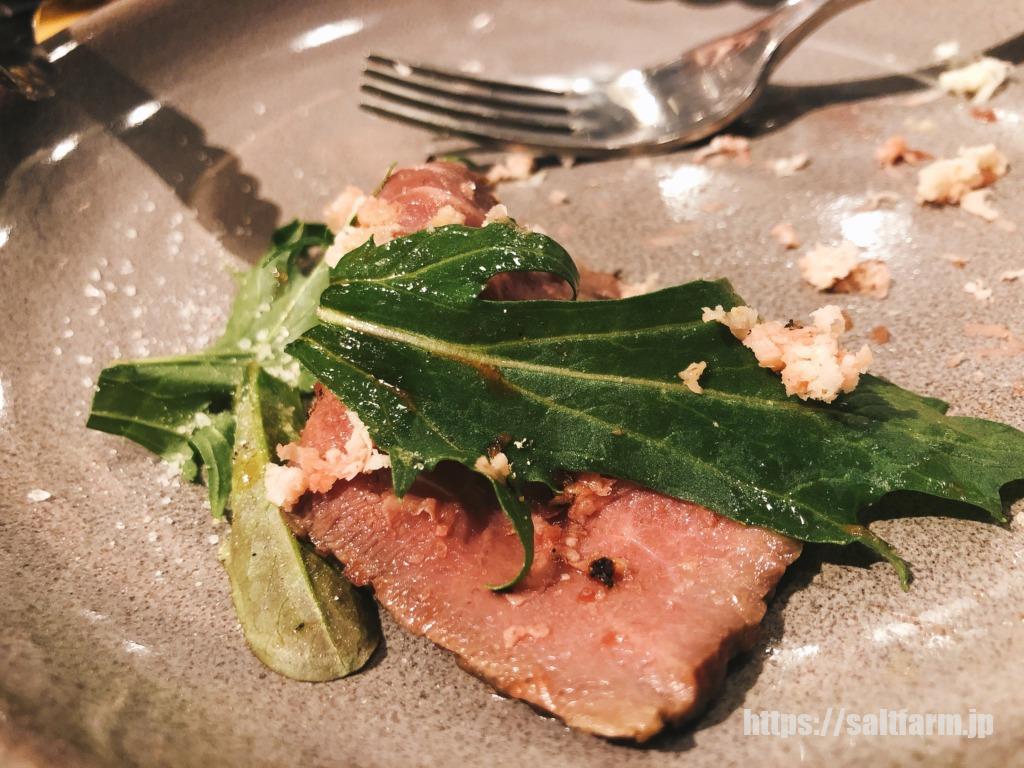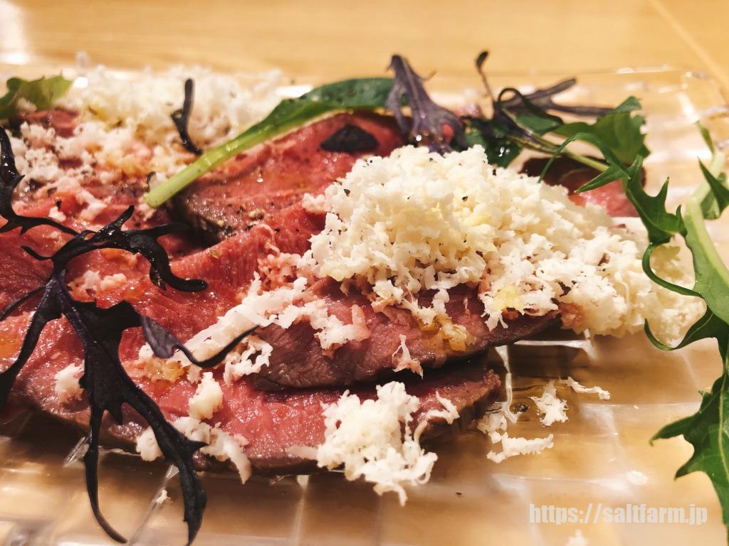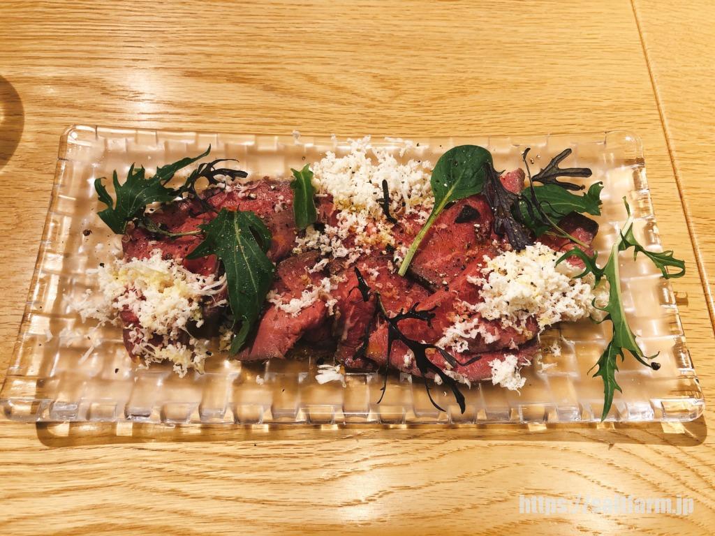 道産牛のローストビーフの上に山わさびがたっぷりかかっています。