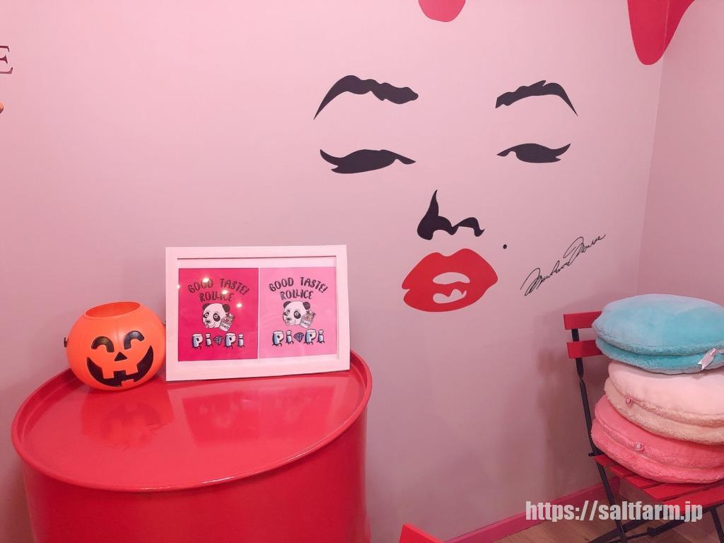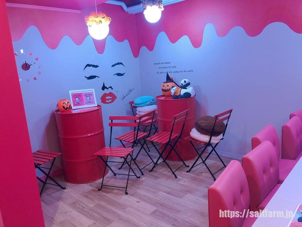 店内はピンク×赤×白で統一されていました。ライトが少ないので、部屋は少し暗めになっています。