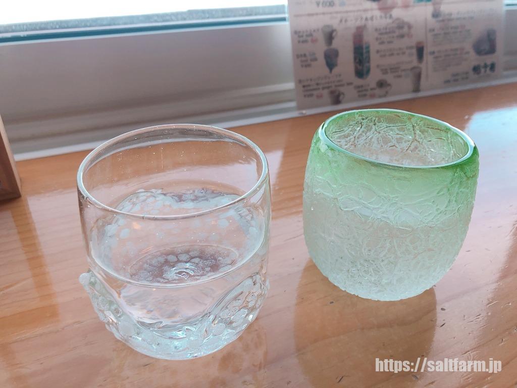 グラスは工房で作られたモノだそうです。自分で選ぶとなんだか愛着がわきますね。ガラスなので、ずっしりとした重さがあり、独特の質感があります。