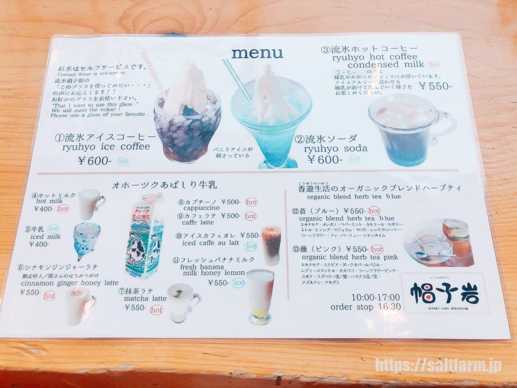 そのほか、地元の「オホーツクあばしり牛乳」を使用したメニューや、香遊生活のオーガニックブレンドティも注文できるようです。
