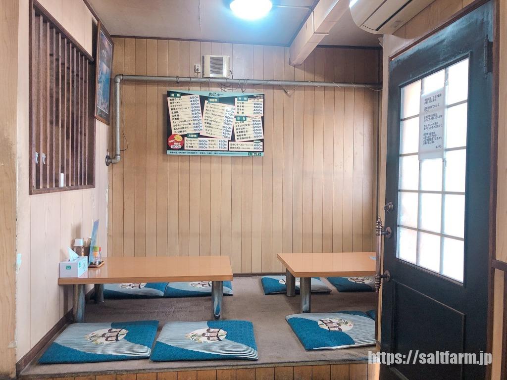 店内はカウンター席、テーブル席、小上がり席がありました。