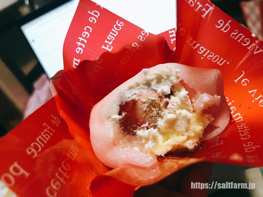 イチゴとクリームとスポンジ生地で、まるでお餅で包んだショートケーキみたいです。美味しい!