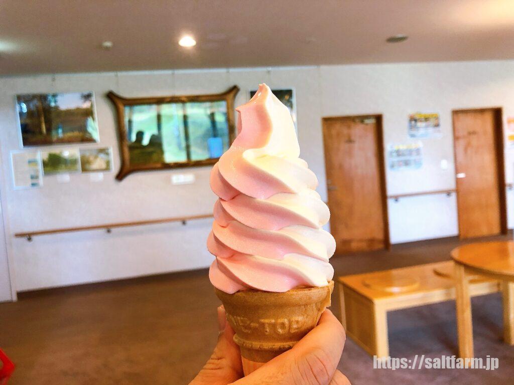 ソフトクリームは、バニラ以外はその日によって違うようです。今回の限定メニューは、イチゴ味でした。