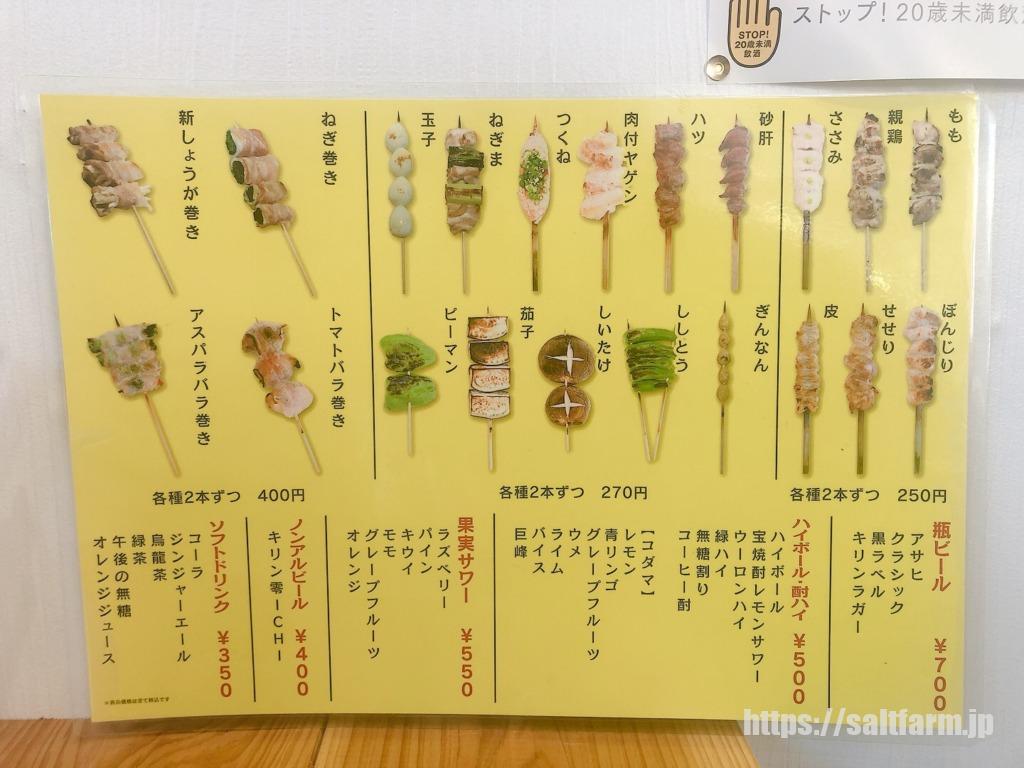 焼鳥の値段は、250円、270円、400円で分かれています。すべて2本ずつ。