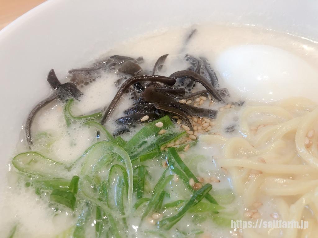 具材はネギ、キクラゲ、半熟卵、チャーシュー(鷄ハム?)、ゴマ