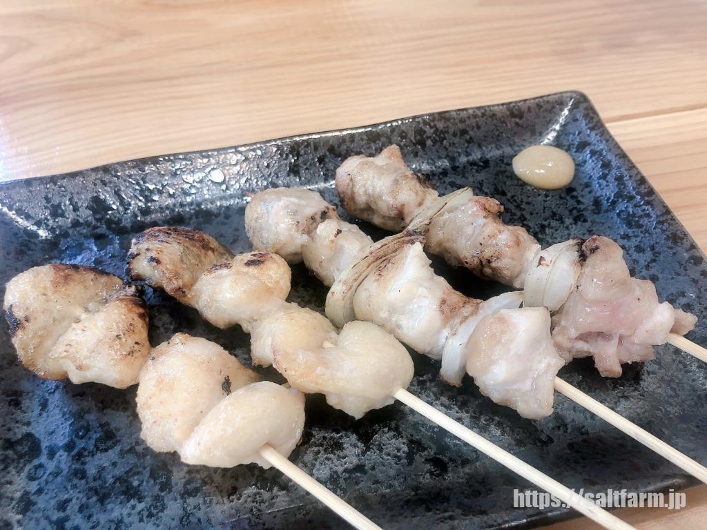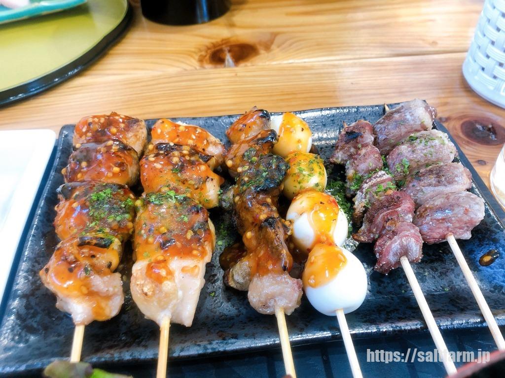 焼き鳥は、もも肉2本、鶏かわ、うずらのたまご、砂肝、ハツの計6本です。