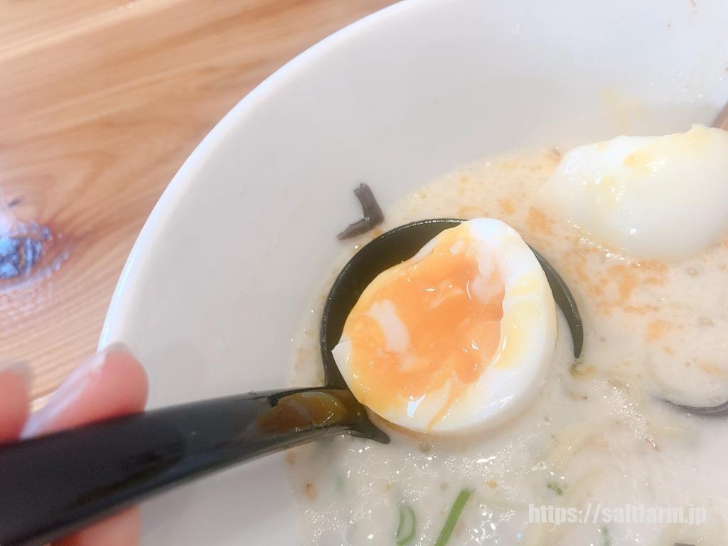 半熟卵は柔らかくてぷるぷるでした。割ることで、スープがまろやかになります。